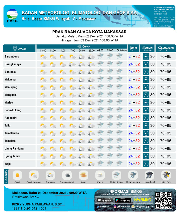 Salah satu daerah yang diprediksi akan mengalami cerah berawan pada Kamis besok yakni Kota Makassar, dimana seluruh kecamatan di Ibu Kota Sulawesi Selatan tersebut akan cerah berawan pada pagi hingga sore hari, sementara malam harinya akan berawan.