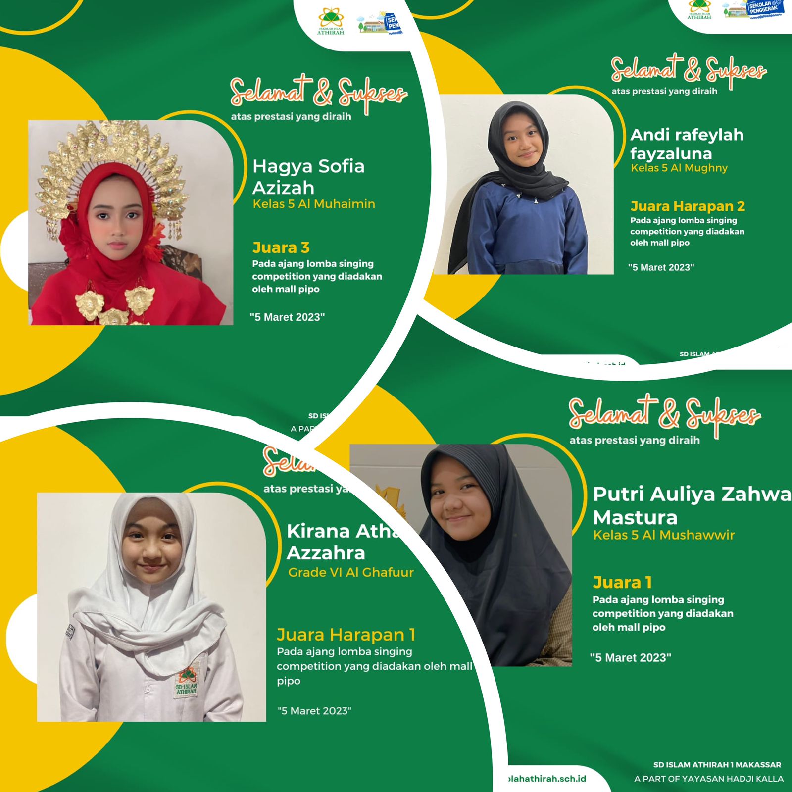 SUARACELEBES.COM, MAKASSAR – Empat siswi SD Islam Athirah 1 Makassar kembali meraih juara pada ajang Singing Competition yang diselenggarakan di PIPO Mall, Minggu (5/3/2023).