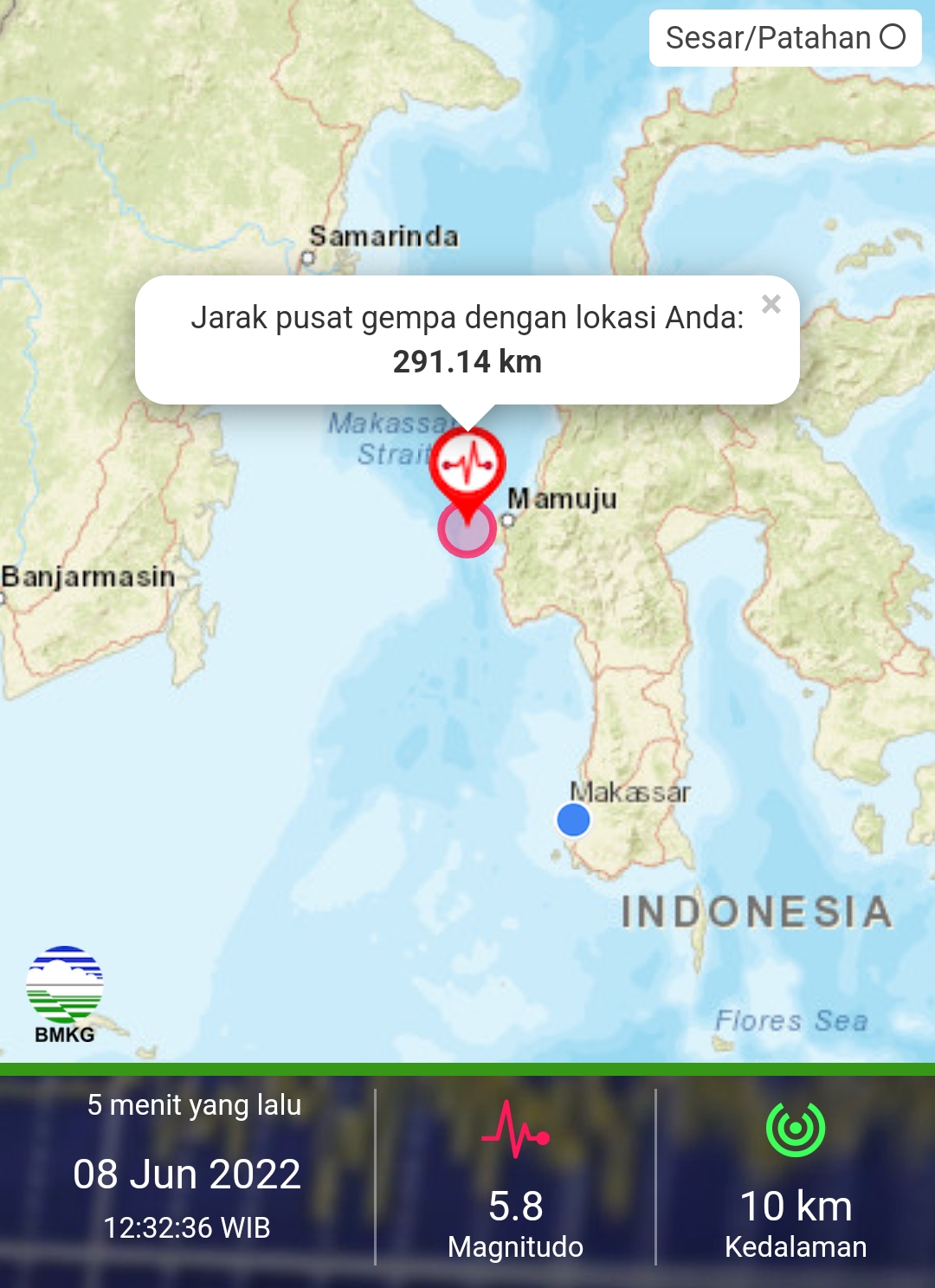 Dalam rilis BMKG melalui aplikasi gempa, kejadian yang berlangsung pada pukul 12.32 Wita, Rabu (8/6/2022) ini terjadi pada kedalaman 10 Kilometer dengan daya 5,8 Magnitudo.