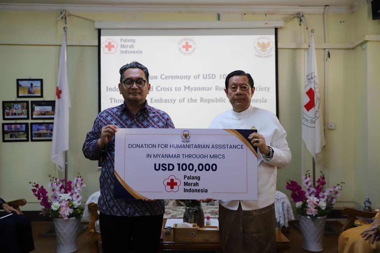 Penyerahan donasi dilakukan oleh Kuasa Usaha ad Interim KBRI Yangon, Muhammad Arif Hidayatullah, kepada Presiden Palang Merah Myanmar, Prof. Dr. Myo Nyunt, pada Kamis, (7/8/2025) di Yangon, Myanmar.