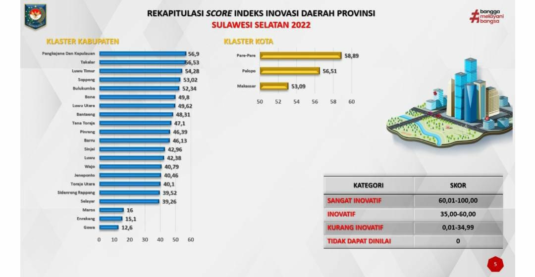 Berdasarkan hasil skor indeks inovasi kabupaten/kota se Sulsel, Kabupaten Pangkep mendapatkan nilai tertinggi dengan angka 56,9 untuk klaster kabupaten.
