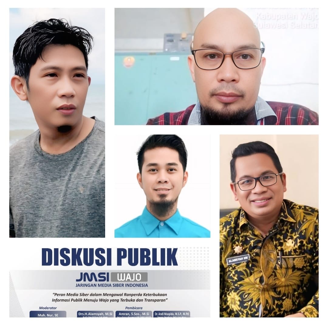 Kegiatan yang dimulai pukul 15.30 Wita ini menghadirkan tiga pembicara: Kadis Pendidikan Kabupaten Wajo Drs. H. Alamsyah, M.Si, Ketua Pansus Ranperda KIP DPRD Wajo Amran, S.Sos., M.Si, dan Dewan Pembina JMSI Wajo Dr. Andi Muspida, M.SP., M.Pd. Diskusi dipandu oleh Muh. Nur, SE.