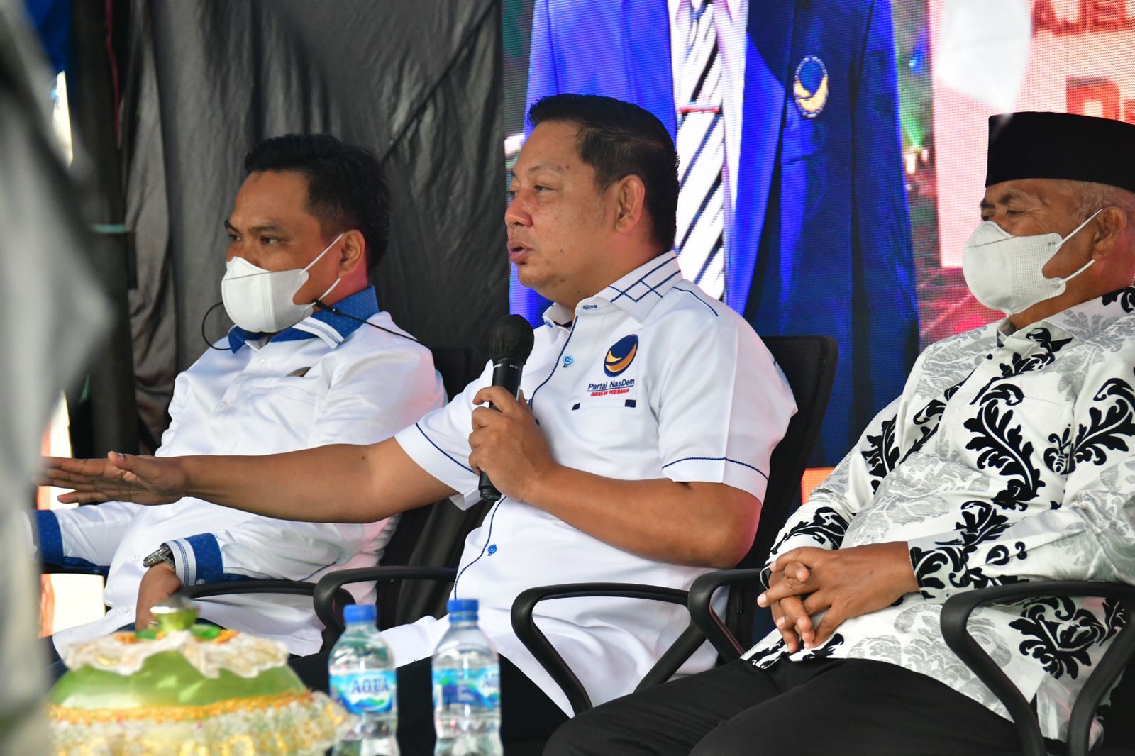 Muslimin Bando diawal-awal sambutannya membahas sedikit proses Pilkada lalu yang mengantarkan dirinya duduk bersama Wakil Bupati dari Partai NasDem, Asman.
