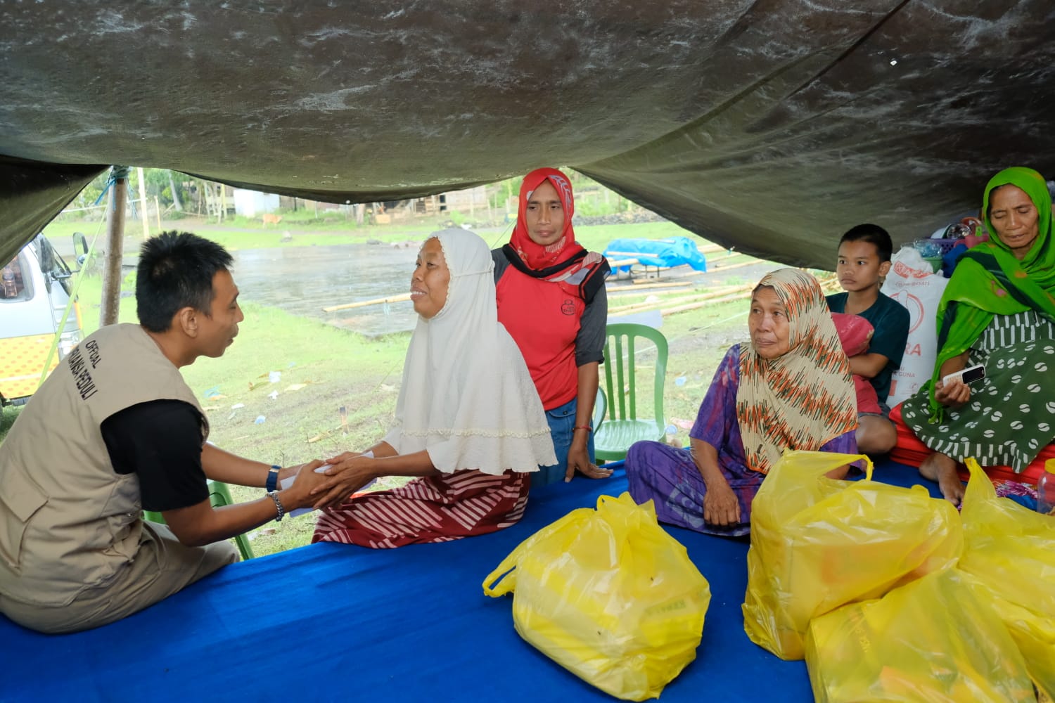 Setelah menerima bantuan Supriansa, Jumaming dan tim Super Peduli nampak berbincang penuh haru, terlihat mereka diselimuti suasana saling menguatkan.